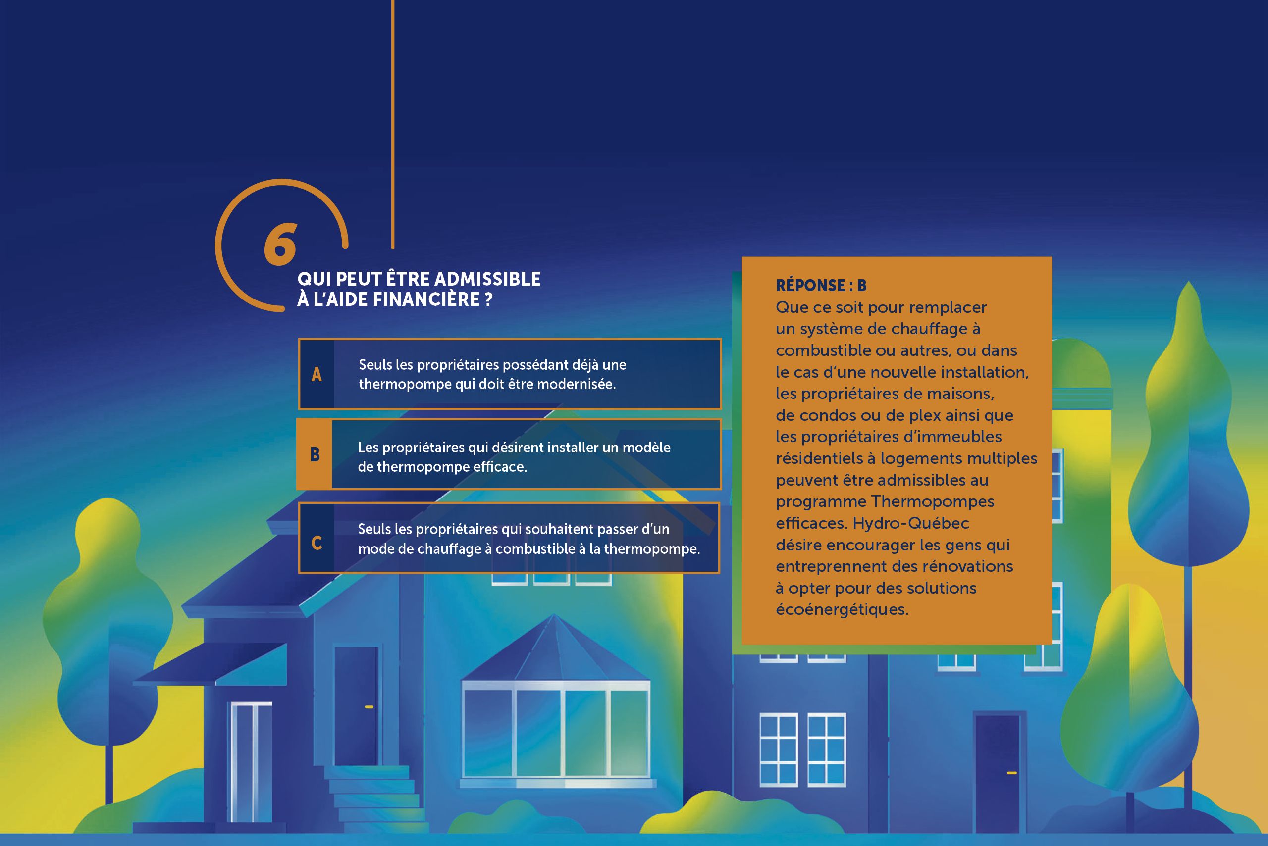 Hydro-Québec aide financièrement la clientèle résidentielle à faire l’acquisition et l’installation d’une thermopompe dans le cadre de son programme Thermopompes efficaces. En effet, depuis février 2021, plus de 79 000 participants et participantes ont bénéficié d’une aide financière allant jusqu’à 2 800 $. Idéales pour chauffer et refroidir la maison, les thermopompes contribuent à diminuer la facture d’électricité tout en offrant des avantages écoénergétiques remarquables. Les connaissez-vous ?
